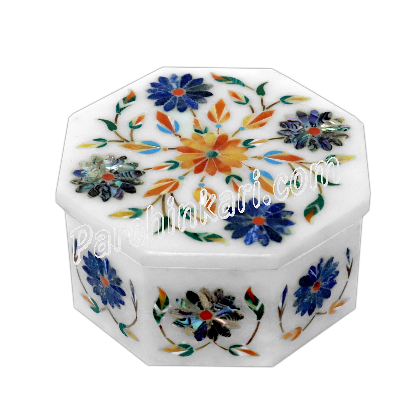 This White Marble Octangular Inlaid Box will be Nice for a Gifts on this coming Xmas and New Year Gift Purpose. This Box is Inlaid with Semi-Precious Stones as Malachite, Lapislazuli, Abalone, Pauch Shell, Turquoise and Jasper.