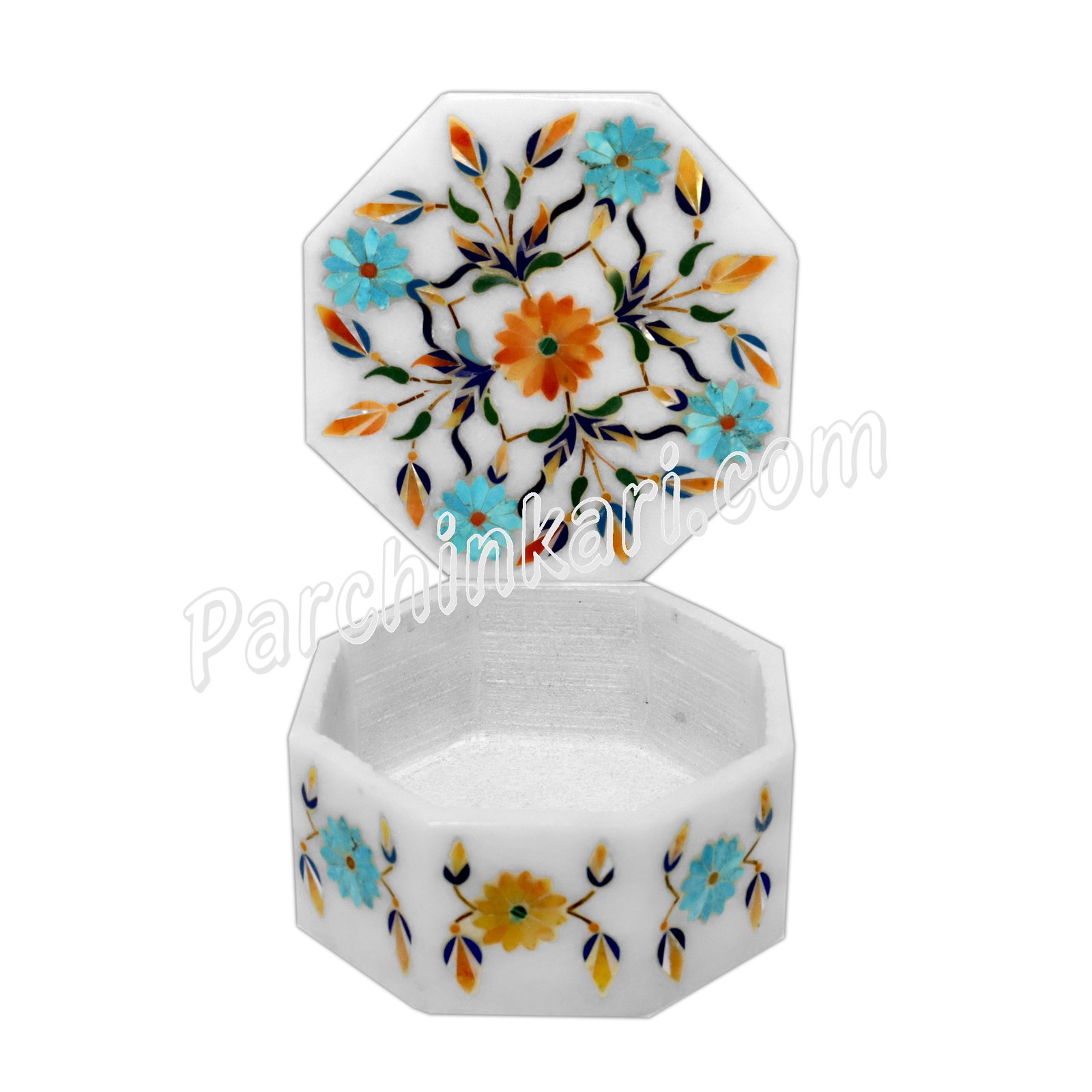 This Octangular white marble inlaid box can be utilized for gems stockpiling and likewise can be utilized for design on the end table and dressing table. This antique gems box enlightens if the light arrangement(Battery LED) is made under the container as should be obvious the magnificence of light brightening in the photos of the crate. Your important bits of adornments would now be able to be set in a lovely box that will upgrade the estimation of the gems and give it the regard it merits. The adaptable antique box might be utilized as a little gems box and memento box or introduction box.