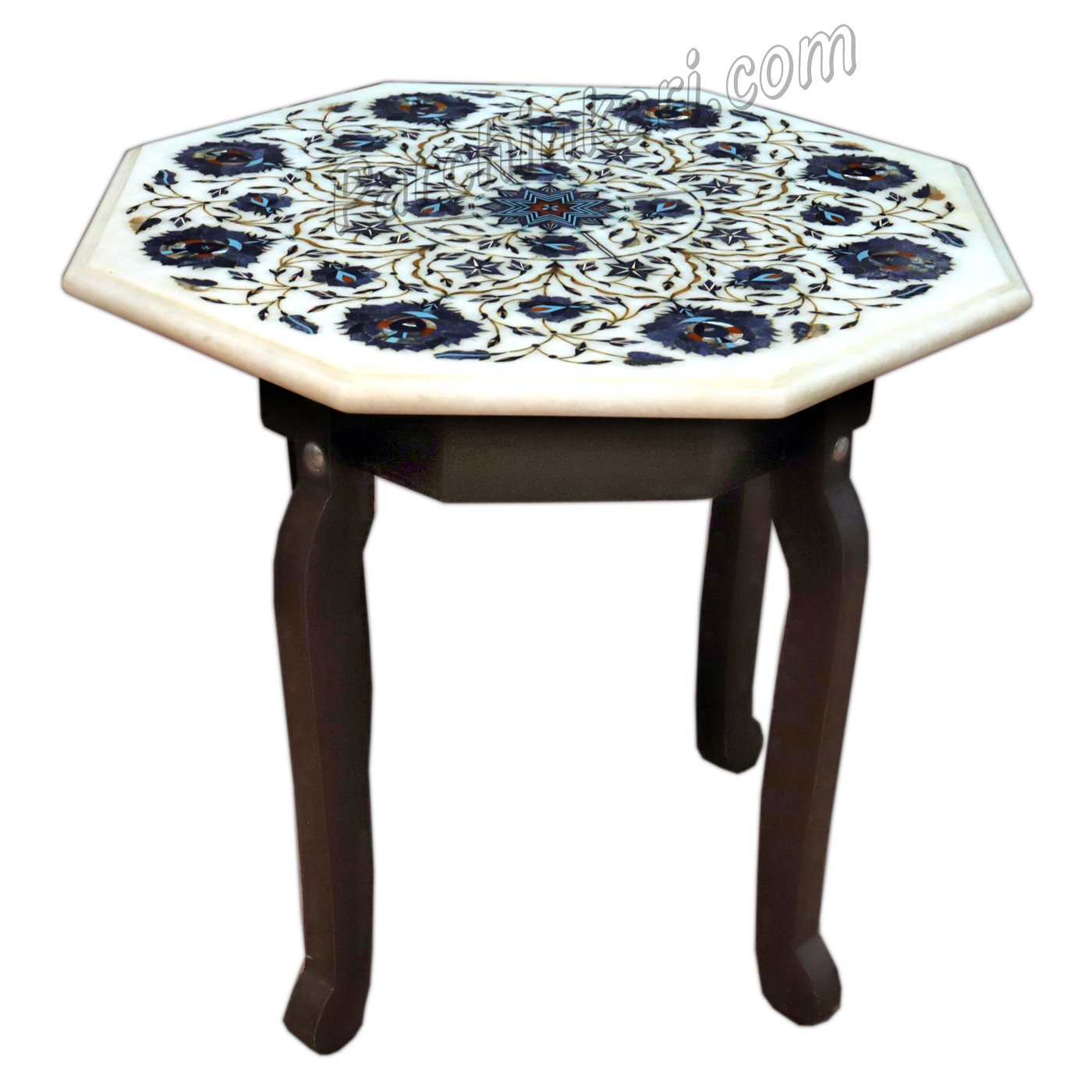 The white marble inlay tabletop is the finest art piece made by the artisan; you can see the details in the pictures that how beautifully the design is made with the natural semiprecious stones. It is a beautiful piece of art which creates a stunning colour contrast in your drawing room or in your bedroom for using as a light table or drinks or as a beautiful decorative piece that could display anywhere in your home(Display Stand Include).