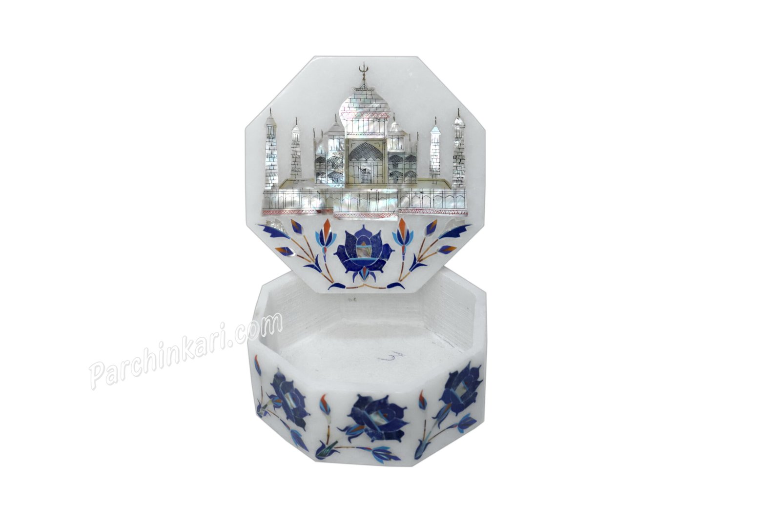 Taj Mahal Design Box for Gifts in White Marble Inlay Art