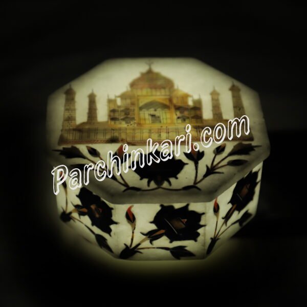 This Octangular white marble inlaid box can be utilized for gems stockpiling and likewise can be utilized for design on the end table and dressing table. This antique gems box enlightens if the light arrangement(Battery LED) is made under the container as should be obvious the magnificence of light brightening in the photos of the crate. Your important bits of adornments would now be able to be set in a lovely box that will upgrade the estimation of the gems and give it the regard it merits. The adaptable antique box might be utilized as a little gems box and memento box or introduction box.